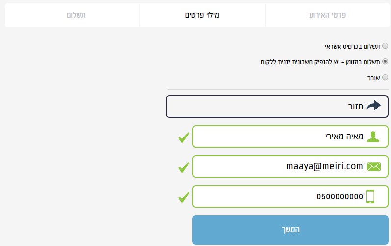 - הזן את פרטי המזמין: שם מלא, דוא״ל וטלפון נייד ולחץ המשך.